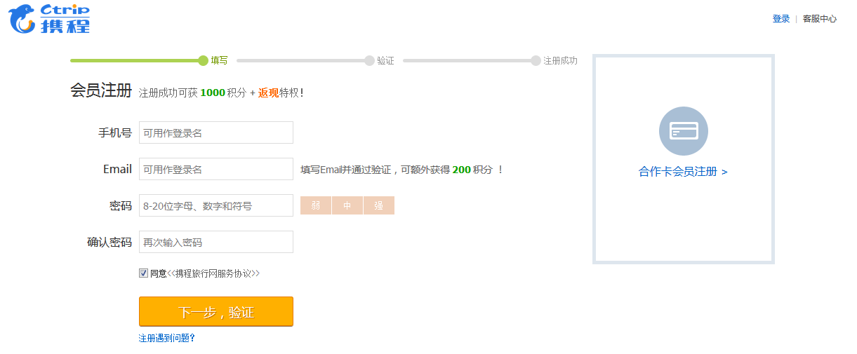用户来到注册页面后,需要途径多个步骤流程,最终完成注册的方式,以天猫、携程、途牛的注册流程为例。