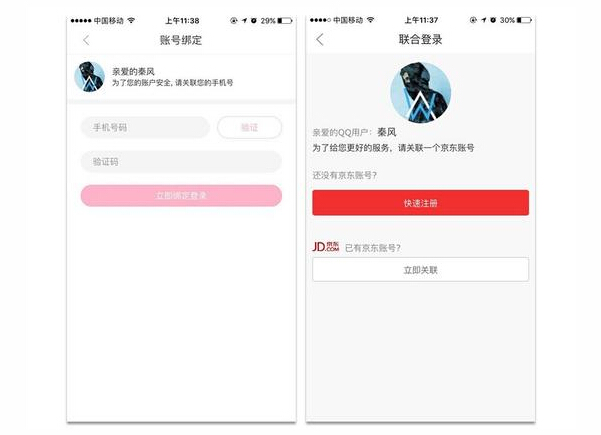 所以,很多app在用户首次利用第三方平台登录后,继续让用户绑定手机号或完善用户信息,以获取更加有效、真实的用户数据,也就是伪第三方注册。