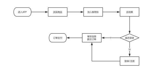 例如,电商类、O2O类产品,终极目标是促使用户下单,大概的流程为:用户浏览、挑选商品;加入购物车;去结算下单。在下单之前尽量不要打断用户流程,只在最后结算的时候,让用户进行登录以获取有效的配送信息。
