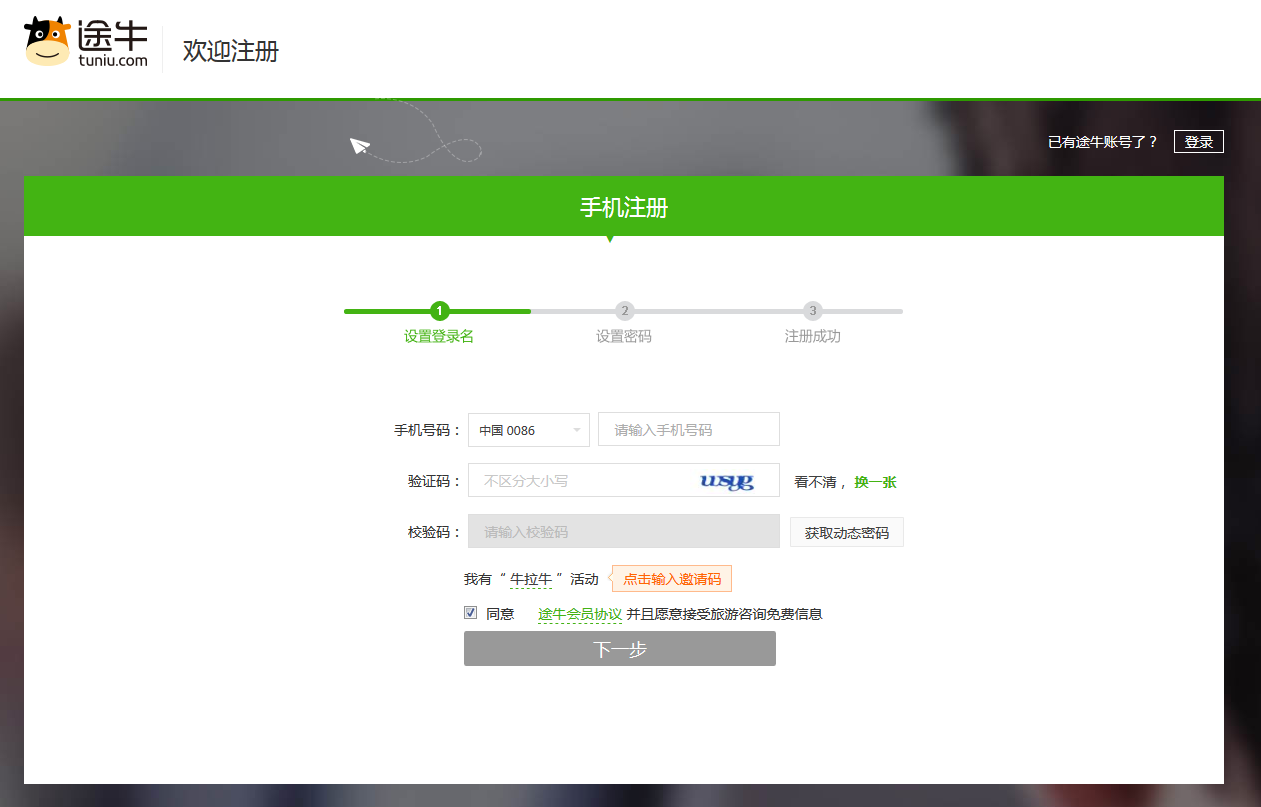 用户来到注册页面后,需要途径多个步骤流程,最终完成注册的方式,以天猫、携程、途牛的注册流程为例。