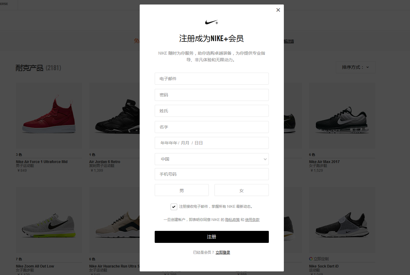 用户点击“注册”入口后不重新打开页面,而是在原页面上出现一个弹窗进行注册流程,除了展示方式外,基本与新开页面的一步式注册遵循相同的设计原则。
