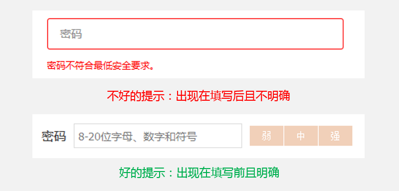 在填写之前告知用户填写规则避免出错,一旦出错及时提醒并提供有效的解决方案,良好的表单提示能够给用户继续完成表单带来动力。