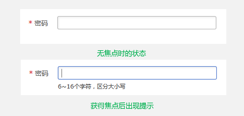 提示信息除了像上图显示的那样通过占位符的方式展现,也可以当每项输入项获得热焦点的时,显示该项的提示信息,并在失去焦点的时候进行验证(不要再用户点击完成按钮的时候在做这些事),这样可以避免填写时无法继续阅读占位符所写提示的问题。