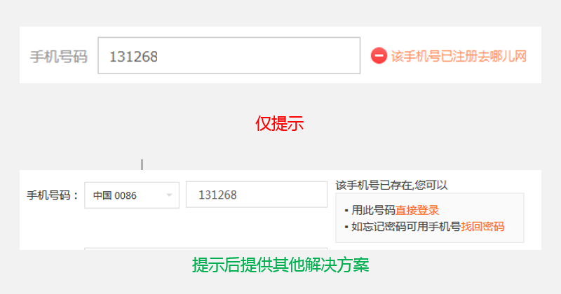 用户出现错误时除了提供及时的错误提示外,还可以清楚的说明原因并提供有效的解决方案。例如用户在填写邮箱时,系统发现该邮箱已注册,可为用户提供登录入口等。