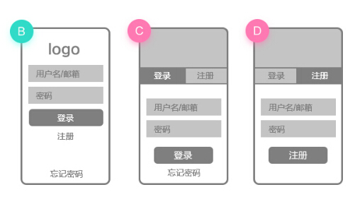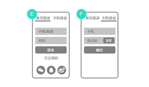 第三种,用户名或者手机登录。这种界面表现形式如图EF,是一个标签切换登录方式。一个界面上可以切换手机号登录和账户登录两种方式。这种方式便在台面上的说法是,为了便于用户,提供多种登录选择。