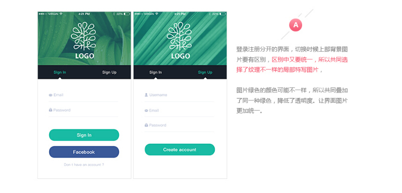 视觉设计前先理清楚界面的逻辑,界面中每个元素的点击从哪里来到哪里去。app因为产品账号体系不同的,所以有各种登录注册方式。登录注册有四种方式。每种方式可以采用不同的形式的背景图设计。找图片有意识的按不同类型分类去寻找图片。要善于运用一些透明地图片调节界面的维度。让界面细节设计更丰富。设计师也要学会运用文字的力量,点睛的文字可以让界面设计增加品质感。