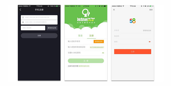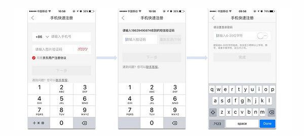 移动端注册大部分只提供手机号快捷注册,注册的流程又大概可以分为两种:同一页面内完成以及按步骤分页面完成注册。