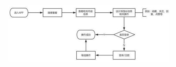 例如,电商类、O2O类产品,终极目标是促使用户下单,大概的流程为:用户浏览、挑选商品;加入购物车;去结算下单。在下单之前尽量不要打断用户流程,只在最后结算的时候,让用户进行登录以获取有效的配送信息。