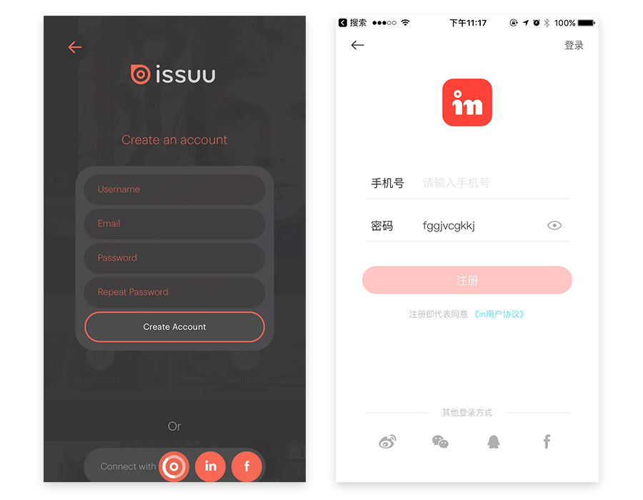 为了确保密码输入正确,很多APP需要用户输入两遍密码来确定密码输入无误,但这无疑增加了用户的工作量。替代方案是在密码输入框右侧增加一个“显示/隐藏icon”,让用户在输入完一遍密码后可以选择点开“显示/隐藏icon”来确保密码输入无误,减少用户的工作量。
