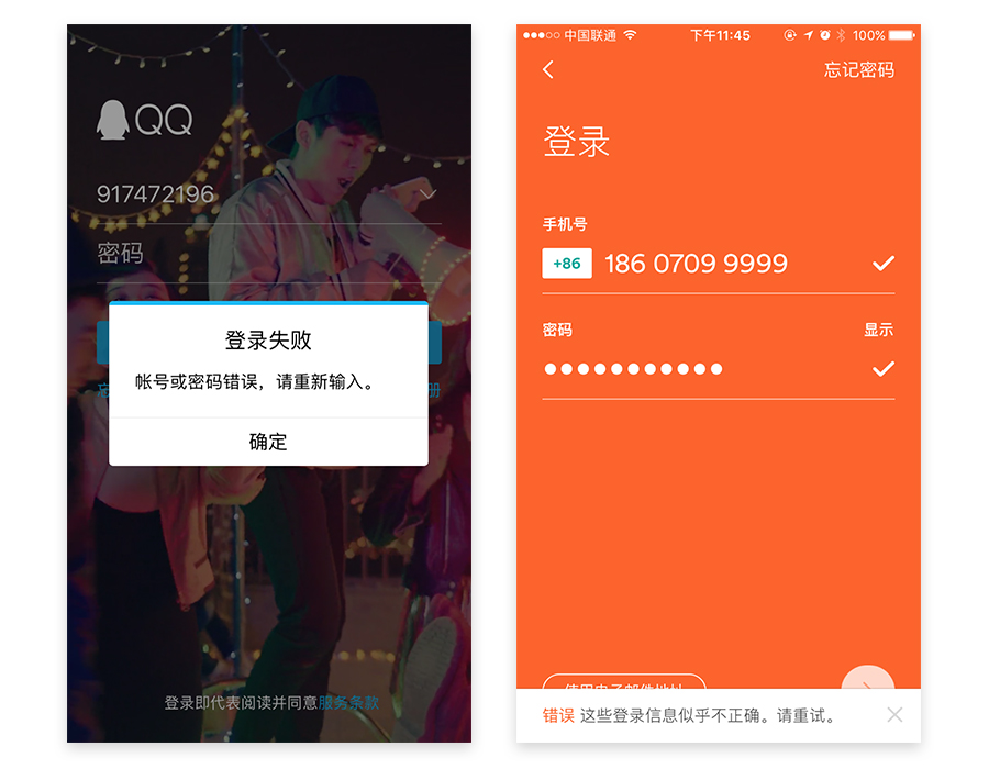 临时框也有两种形式,一种是下图左侧的对话框形式,这需要用户点击确认才能进行下一步操作。一种是toast的形式,弹出一两秒后自动消失。个人更倾向于第二种形式,因为第一种形式相当于强制中断了用户的操作,用户需要点击确认才能回到原来的操作流程。而toast则起到了提示的效果,并且没有打扰到用户。下图右侧的airbnb,在用户输错密码时,不光有底部的临时框提示,还将整个登录页面的背景色油绿色变为醒目的橙色,这种设计在提示用户的前提下,还做到了赏心悦目,是个不错的设计思路。