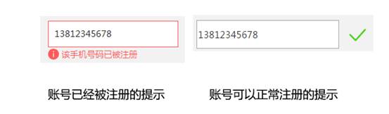 当用户输入手机号,光标离开“手机号码”输入框时,通常我们会立即给用户反馈,这个手机号是否已经被注册,示例如下: