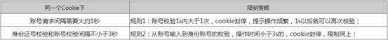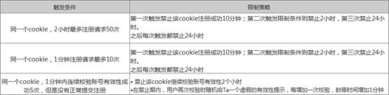 Cookie的风控触发条件和限制策略与IP相同,但是阀值不同。